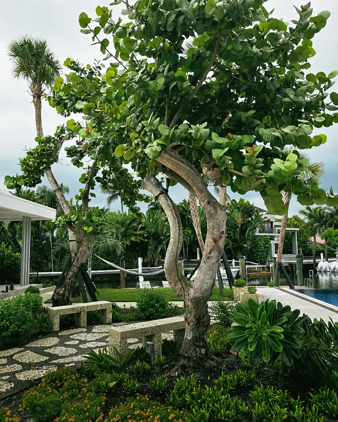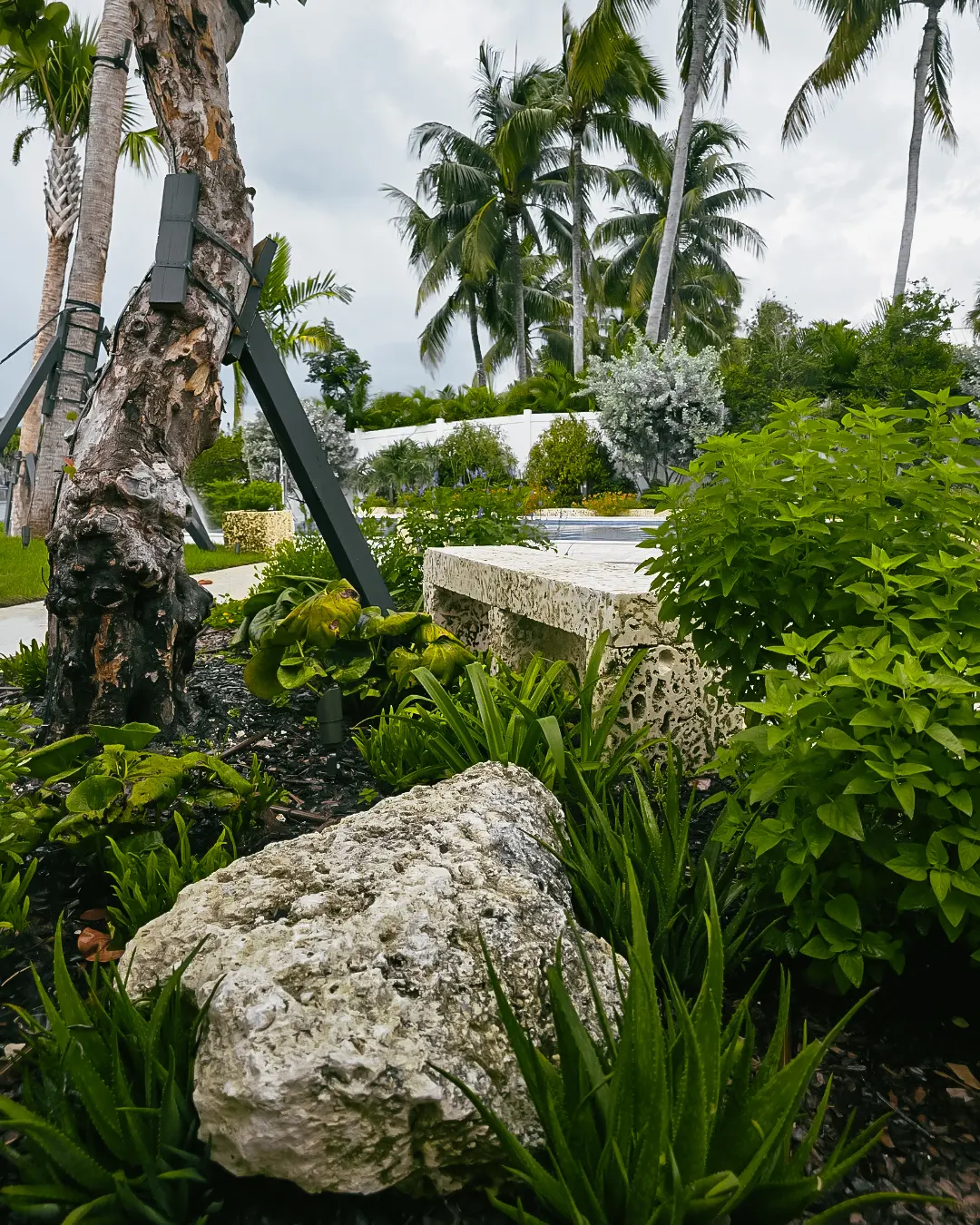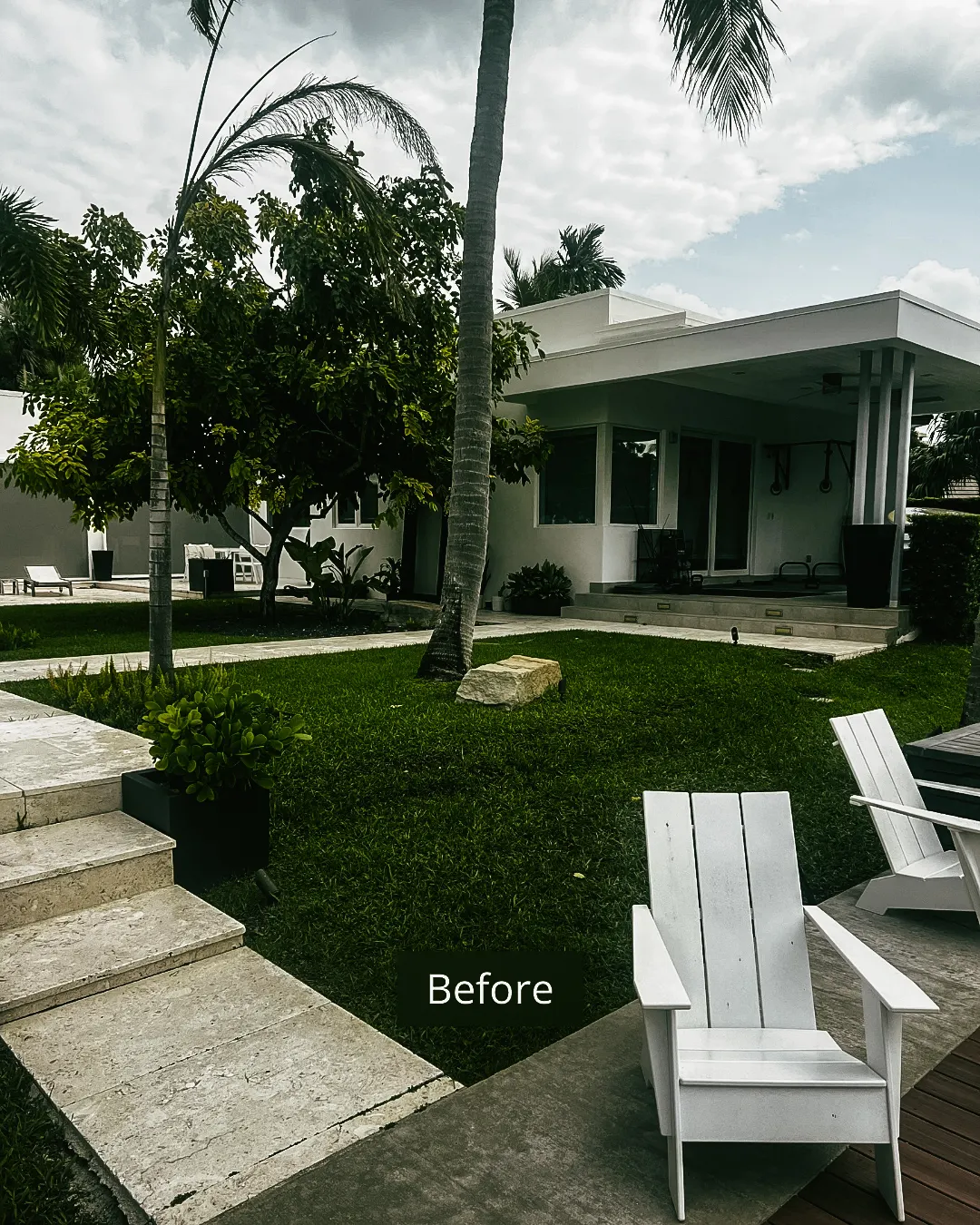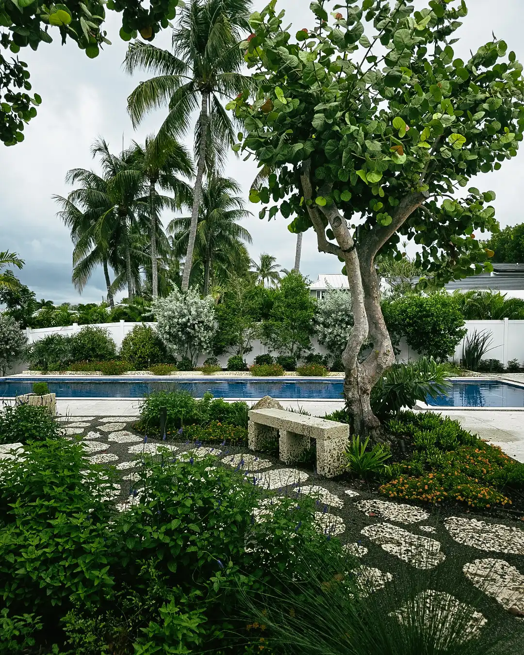 A full landscape and hardscape renovation including retaining walls, oolite planters, shell stone paths, landscape lighting, a new irrigation system, giant Sabal palms and two spectacular Seagrape specimens.