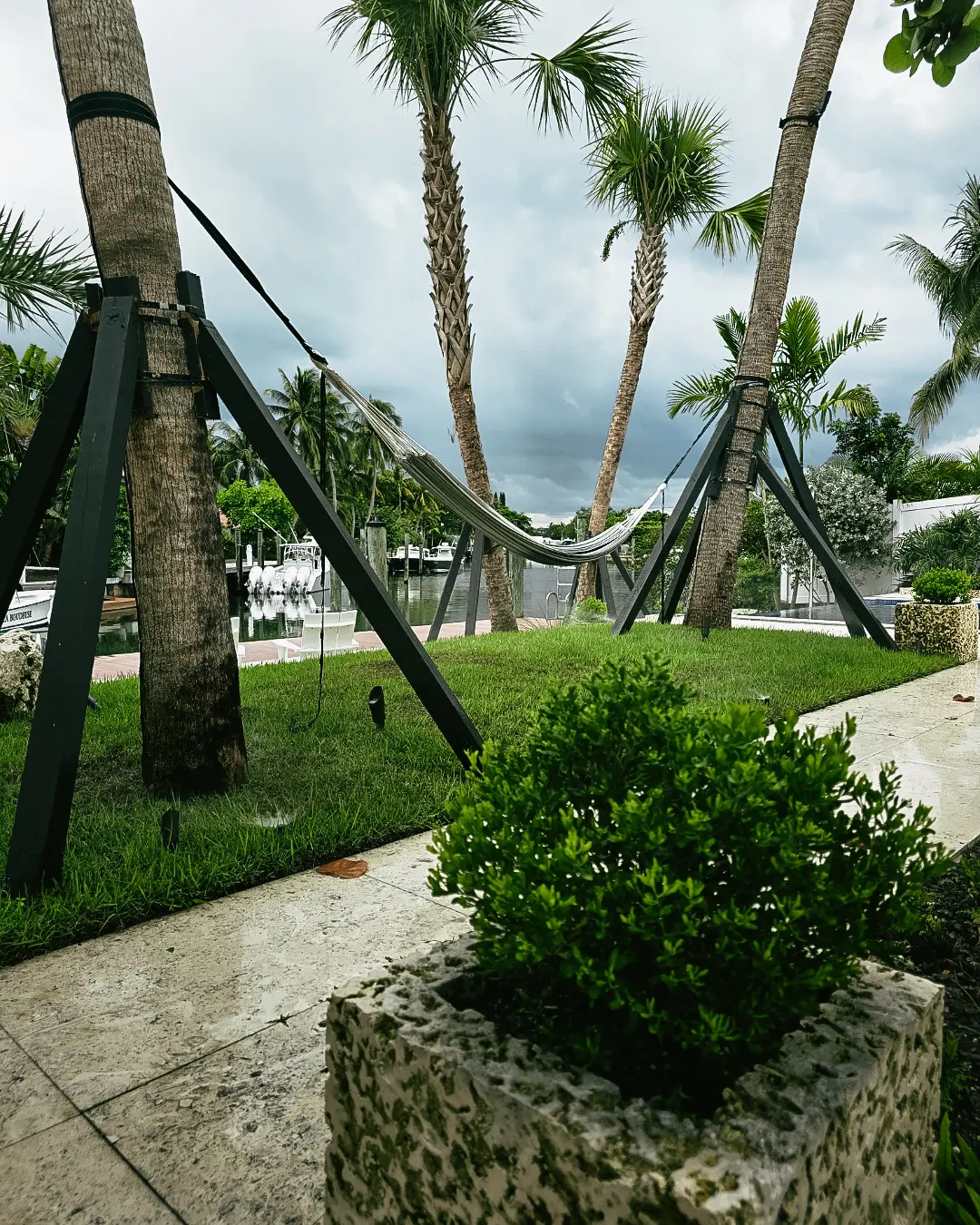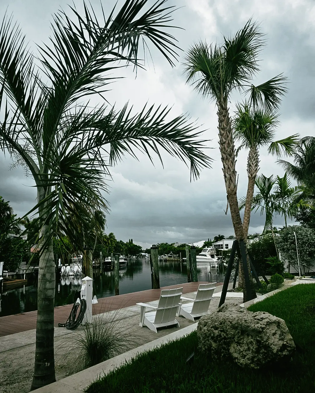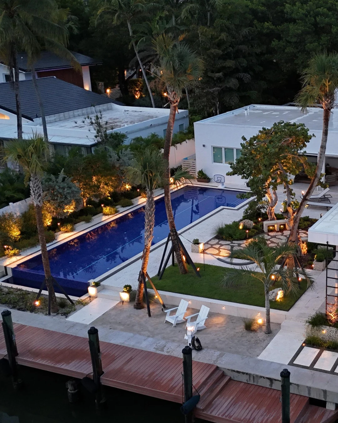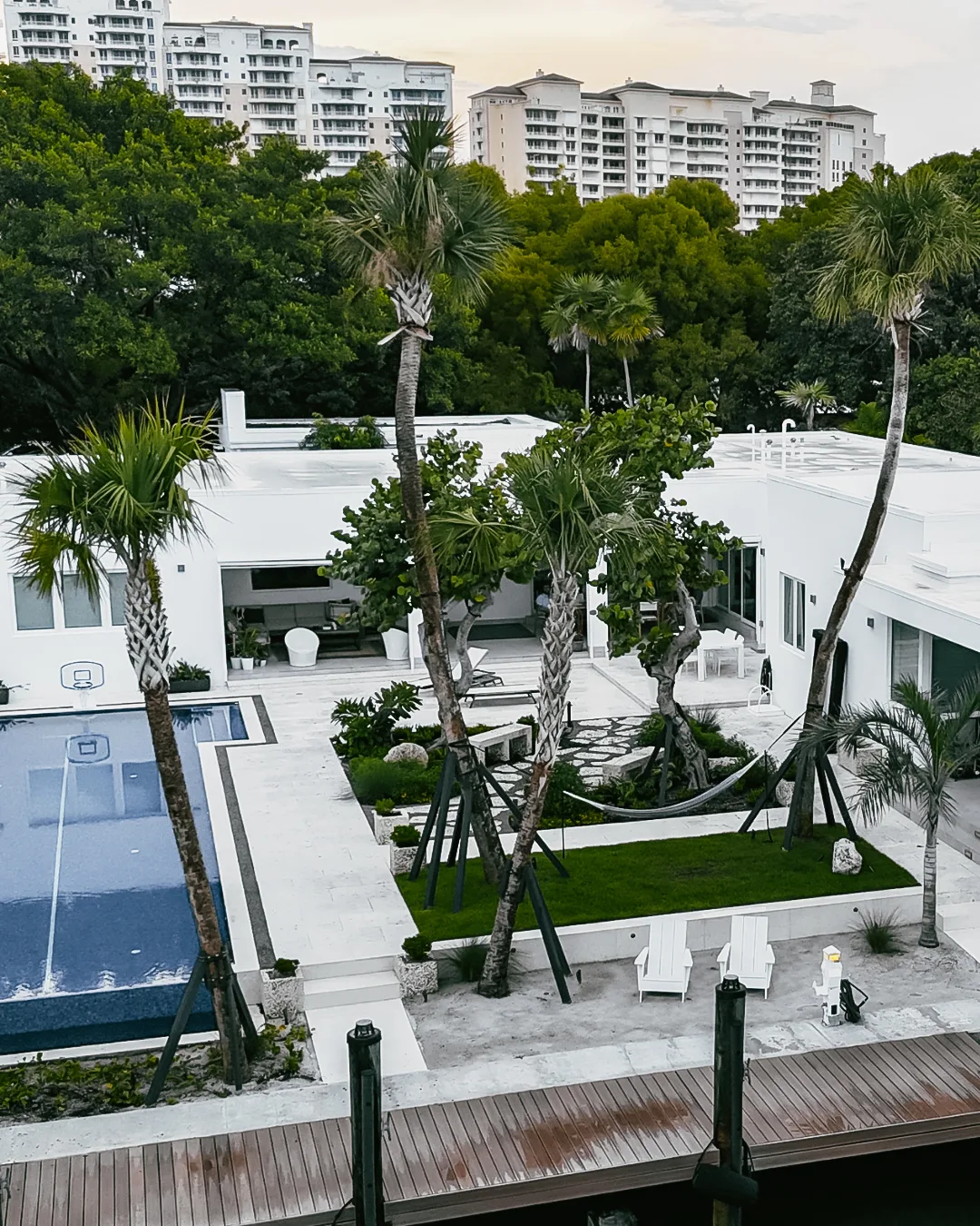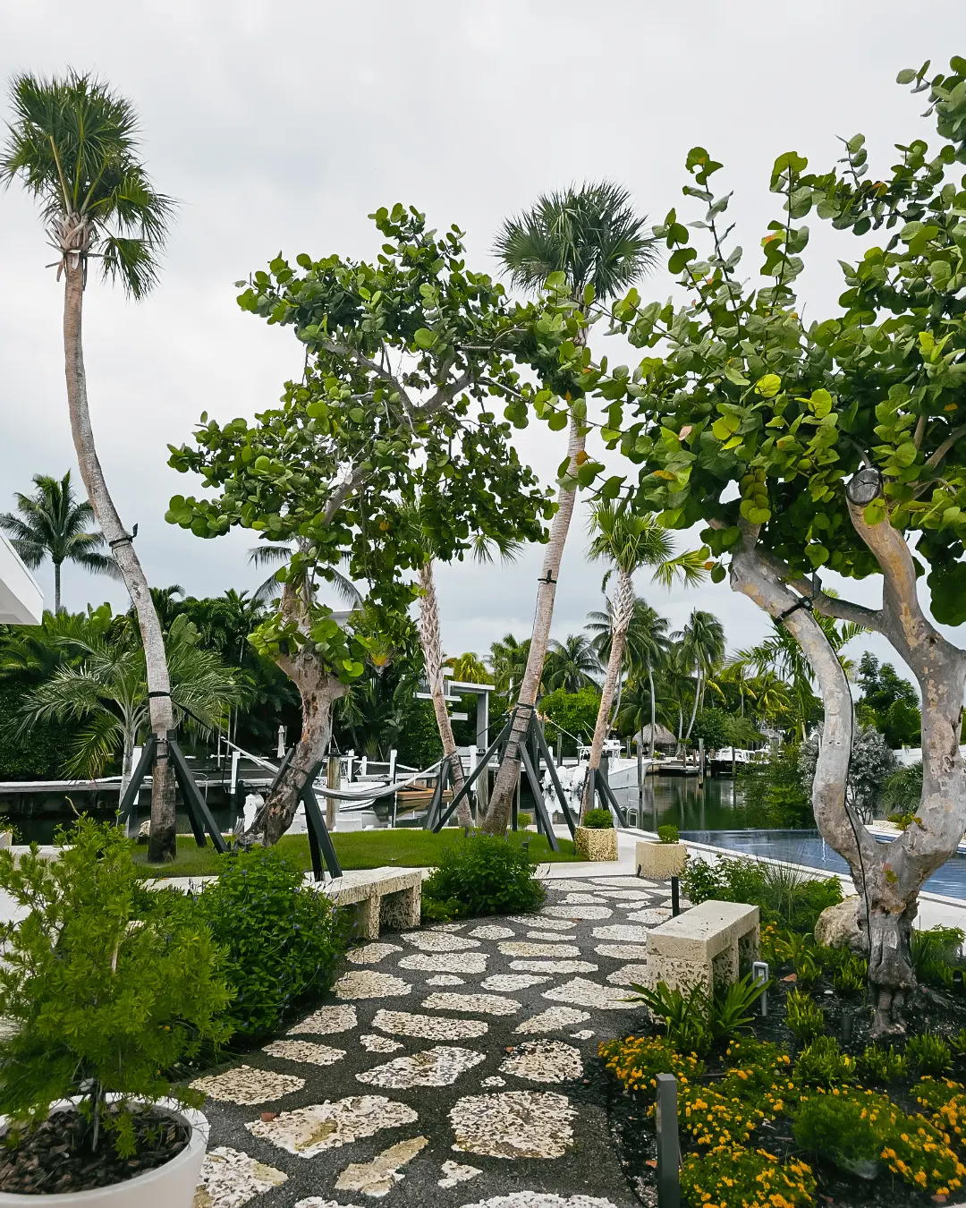 A full landscape and hardscape renovation including retaining walls, oolite planters, shell stone paths, landscape lighting, a new irrigation system, giant Sabal palms and two spectacular Seagrape specimens.
